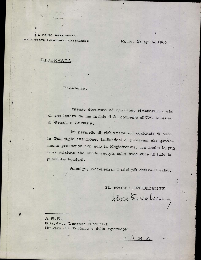 Lettera di Silvio Tavolaro, primo presidente della Corte suprema di cassazione, all'on. Lorenzo Natali, ministro del turismo e dello spettacolo