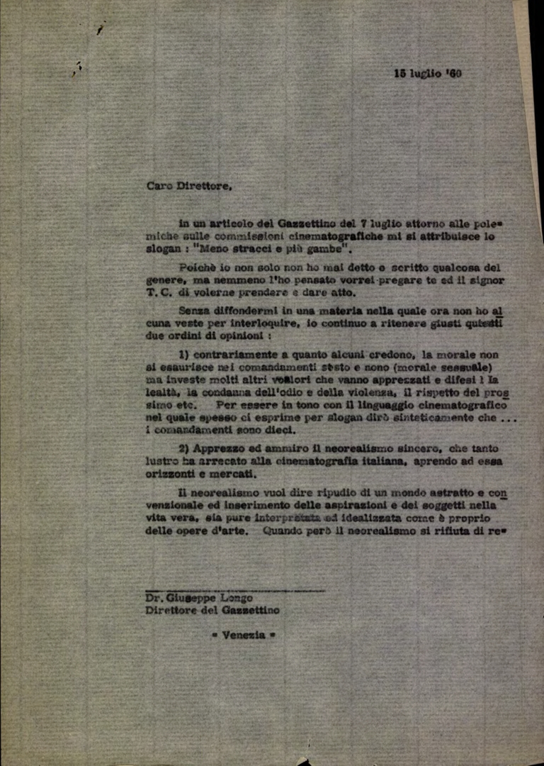 Lettera dell'on. Giulio Andreotti a Giuseppe Longo, direttore de Il Gazzettino di Venezia