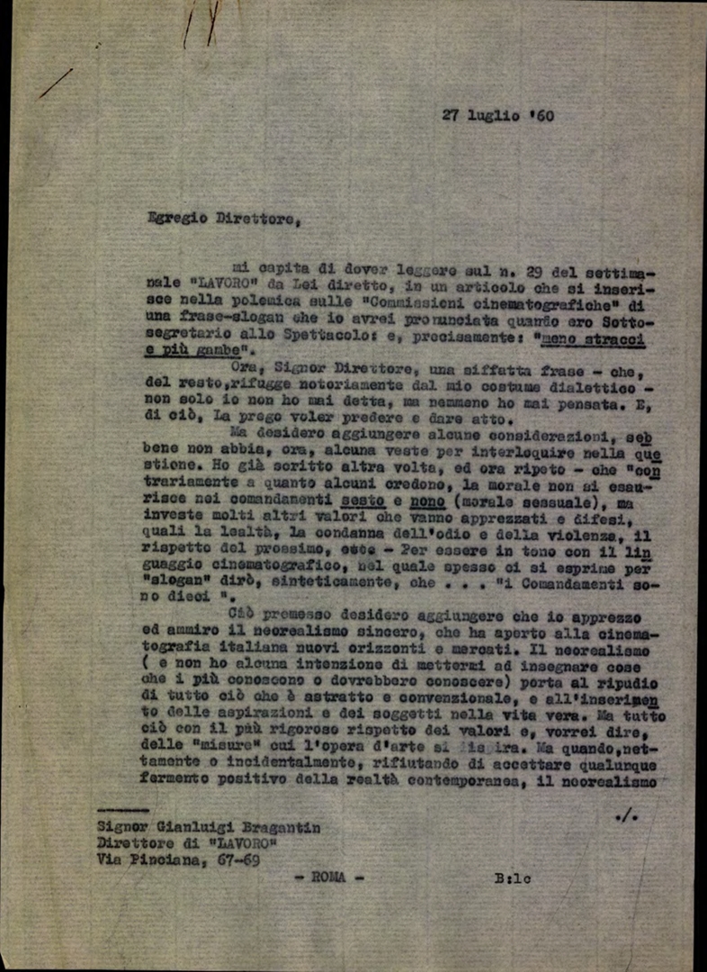 Lettera dell'on. Giulio Andreotti a Gianluigi Bragantin, direttore di "Lavoro"