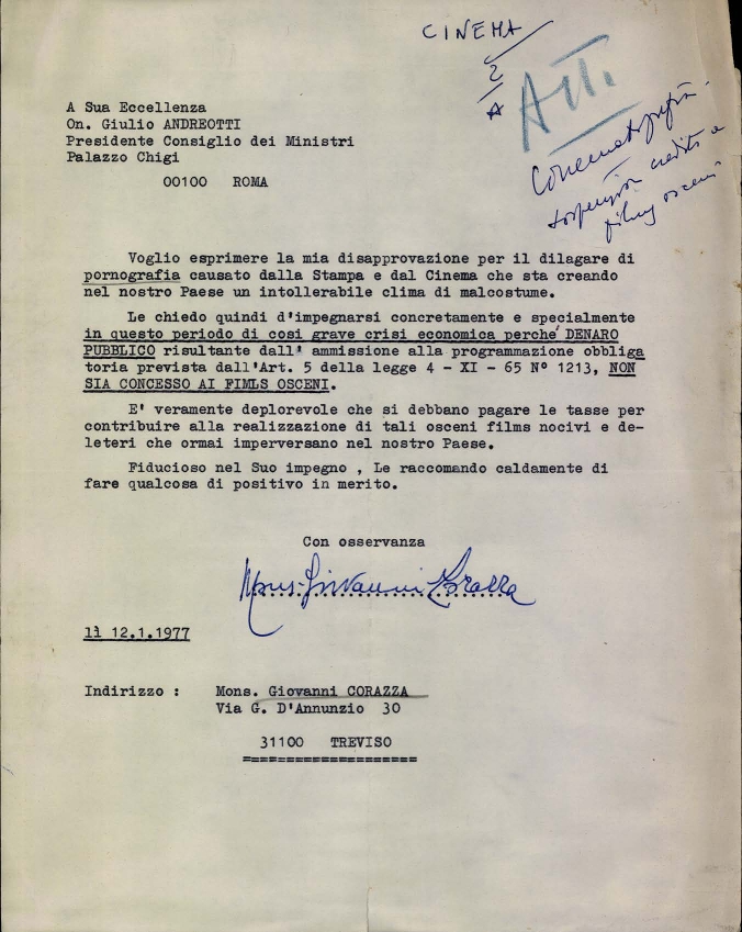 Lettera di mons. Giovanni Corazza all'on. Giulio Andreotti, presidente del consiglio dei ministri