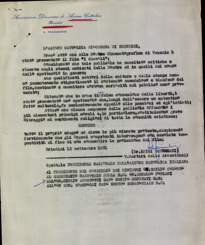 Lettera dell'on. Giulio Andreotti a Luigi De Tommasi, presidente dell'Associazione diocesana di Azione cattolica di Brindisi