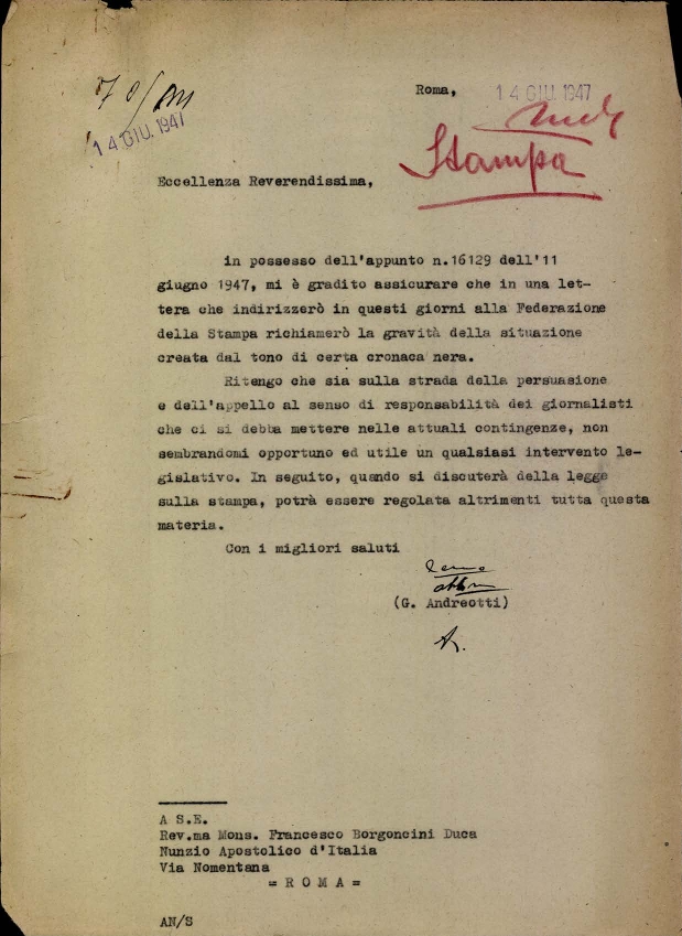Lettera dell'on. Giulio Andreotti a mons. Francesco Borgongini Duca, nunzio apostolico in Italia