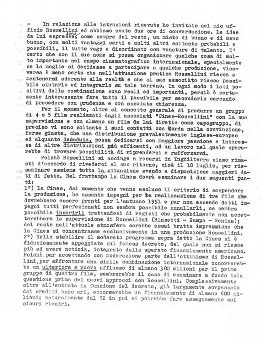 Accordi della Cines con Roberto Rossellini per la realizzazione di alcuni film e considerazioni sui finanziamenti americani per l'attività della casa di produzione