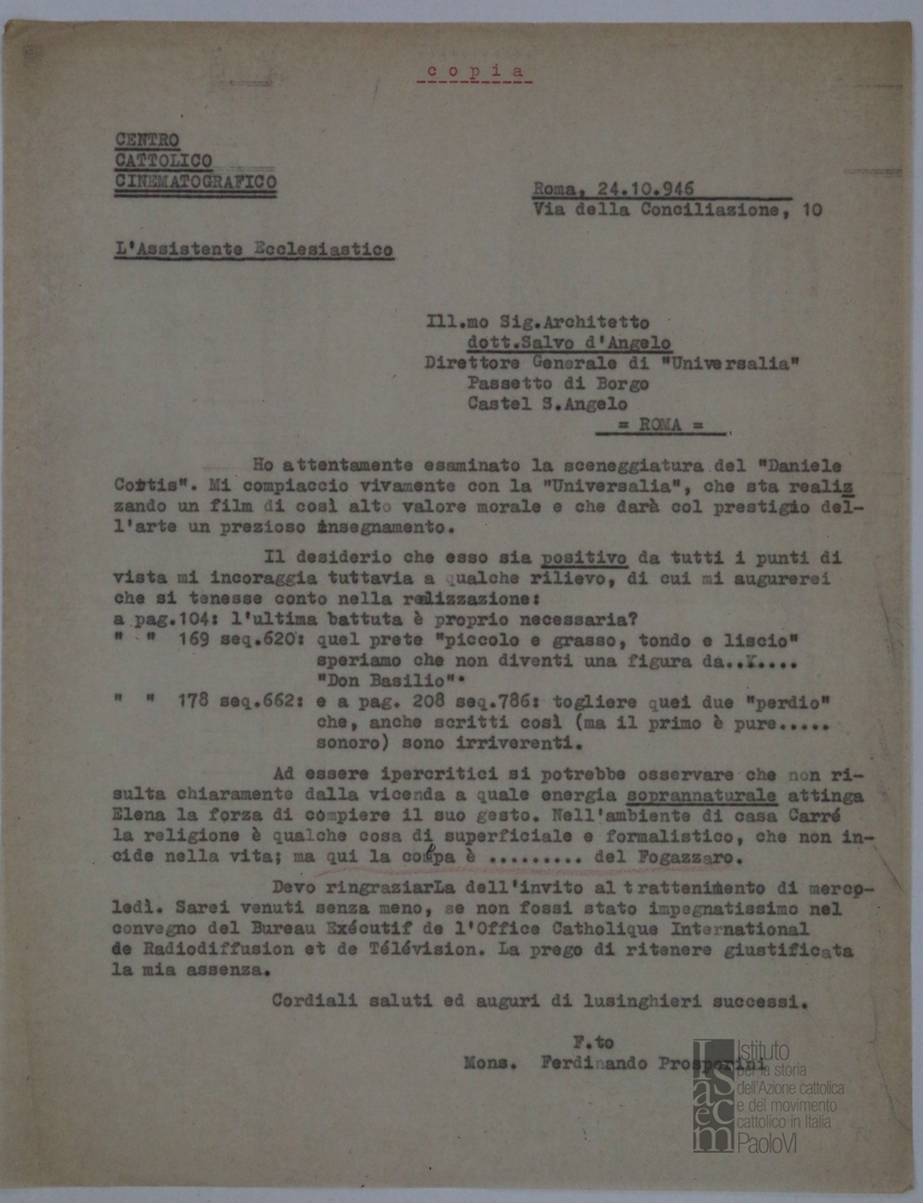 Lettera di mons. Ferdinando Prosperini, consulente ecclesiastico dell'Ente dello spettacolo, a Salvo D'Angelo, direttore generale di Universalia