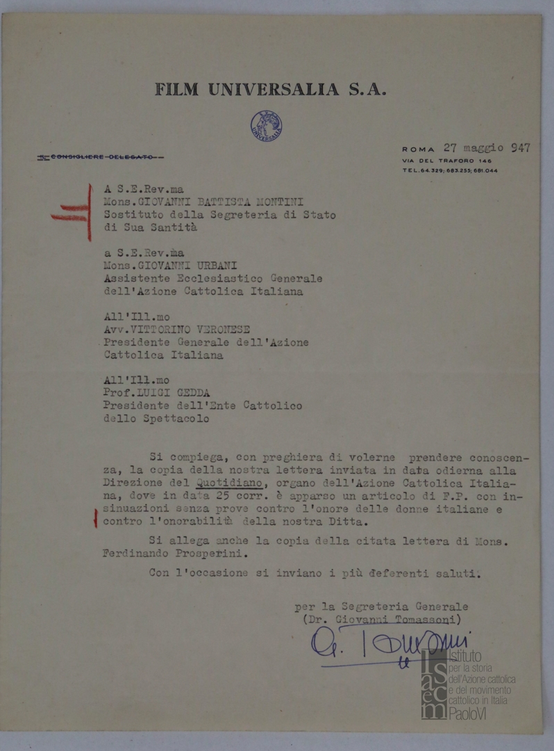 Lettera di Giovanni Tomassoni, della Segreteria generale della Films-Universalia S.A., a Giovanni Battista Montini, sostituto alla segreteria di Stato di Sua Santità, Vittorino Veronese, presidente dell'ACI, Giovanni Urbani, assistente ecclesiastico generale dell'ACI, Luigi Gedda, presidente dell'Ente cattolico per lo spettacolo