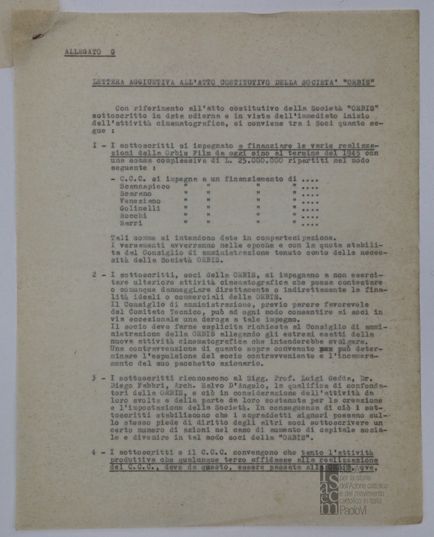 "Lettera aggiuntiva all'atto costitutivo della società Orbis"