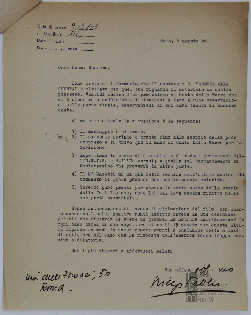 Lettera di Paolo Nicolaj, direttore della produzione editoriale di Universalia, a Luigi Gedda, presidente del Centro cattolico cinematografico - CCC
