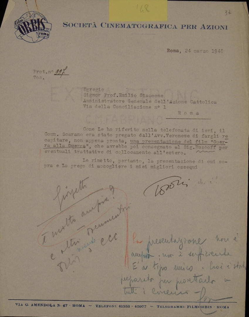 Lettera a firma di [...] su carta intestata della società cinematografica Orbis a Emilio Giaccone, amministratore generale dell'ACI
