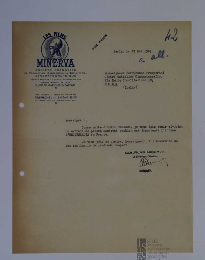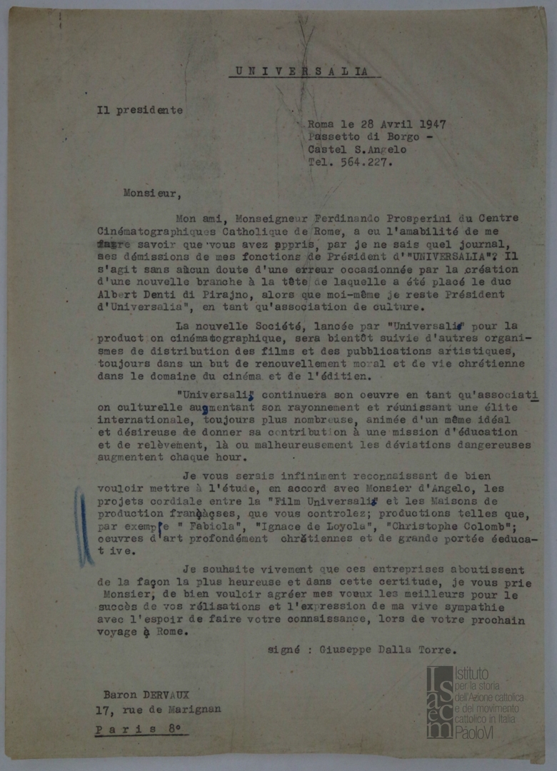 Lettera di Giuseppe Dalla Torre, presidente di Universalia, a Raymond Dervaux, direttore generale della Minerva Film