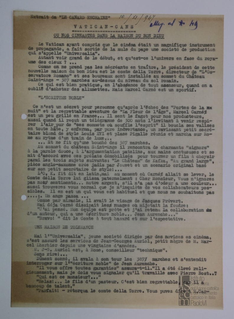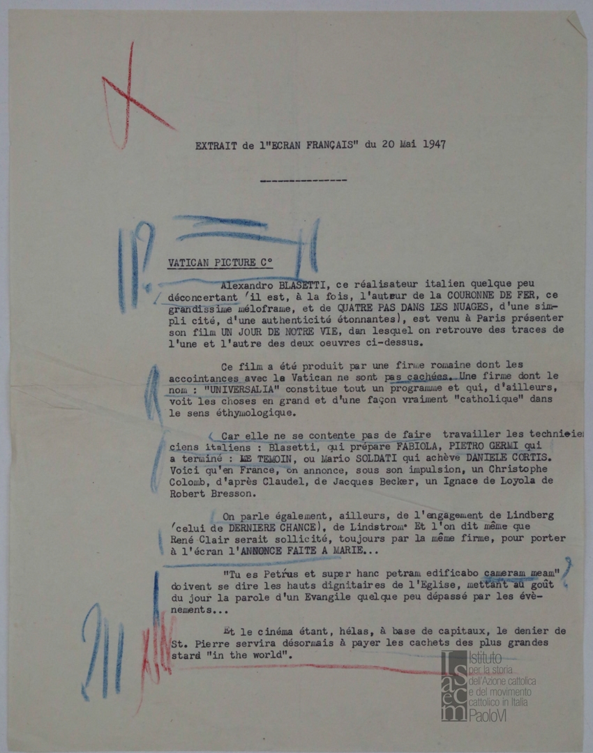 "Extrait de 'L'ecran francais' du 20 may 1947. Vatican picture C°"