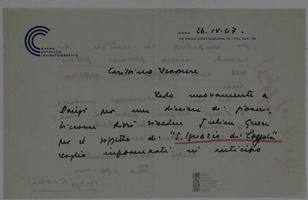 Lettera di Diego Fabbri, segretario del Centro cattolico cinematografico - CCC, a Vittorino Veronese, presidente dell'ACI