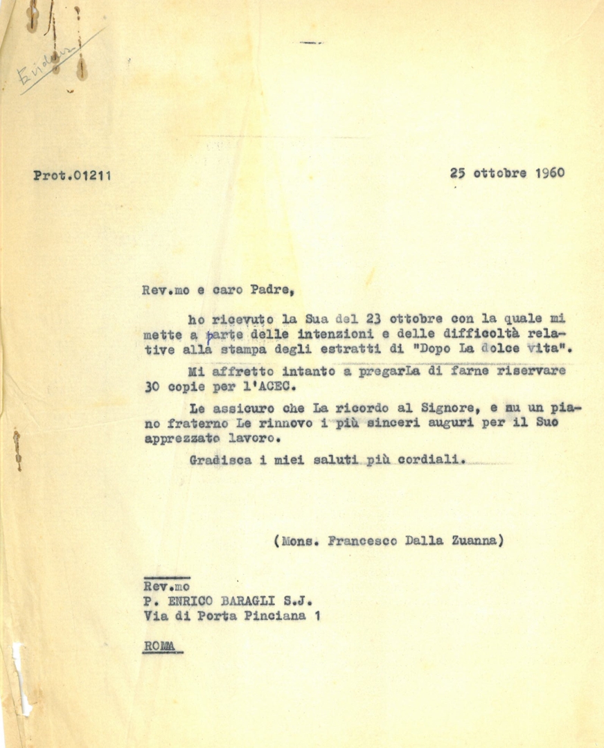 Lettera di mons. Francesco Dalla Zuanna ad Enrico Baragli, gesuita e autore per la rivista Civiltà cattolica