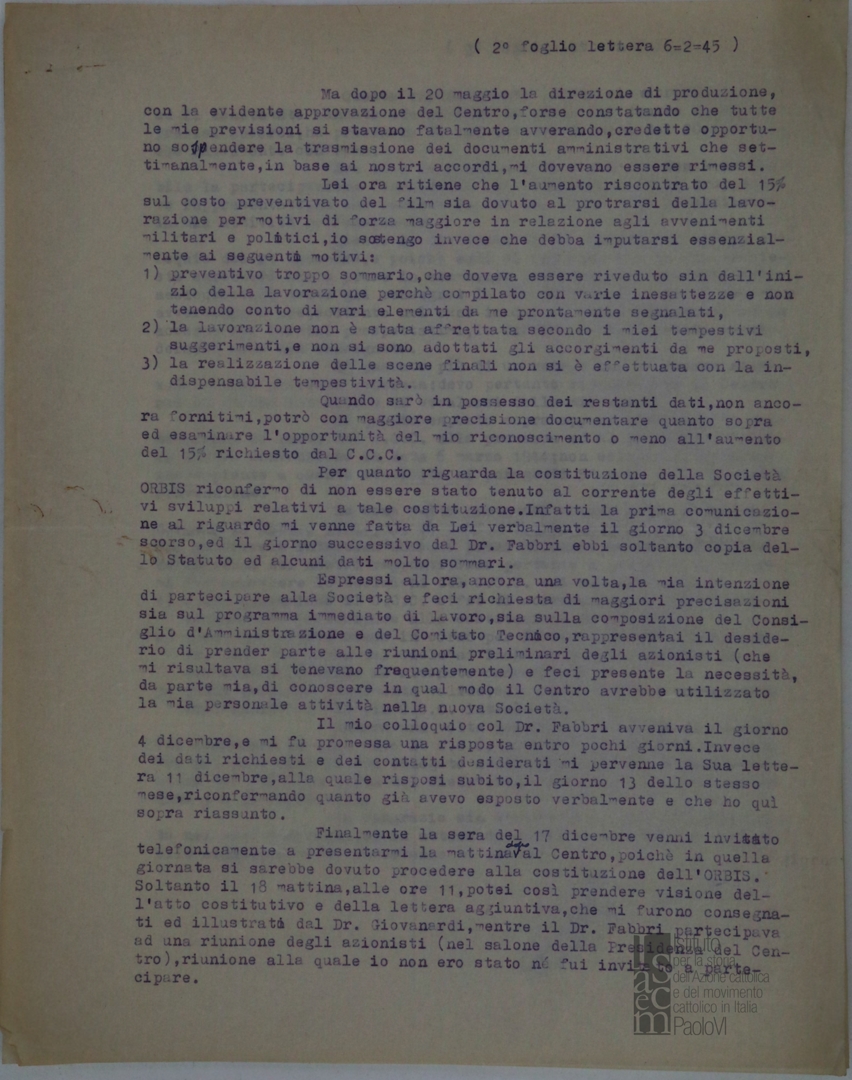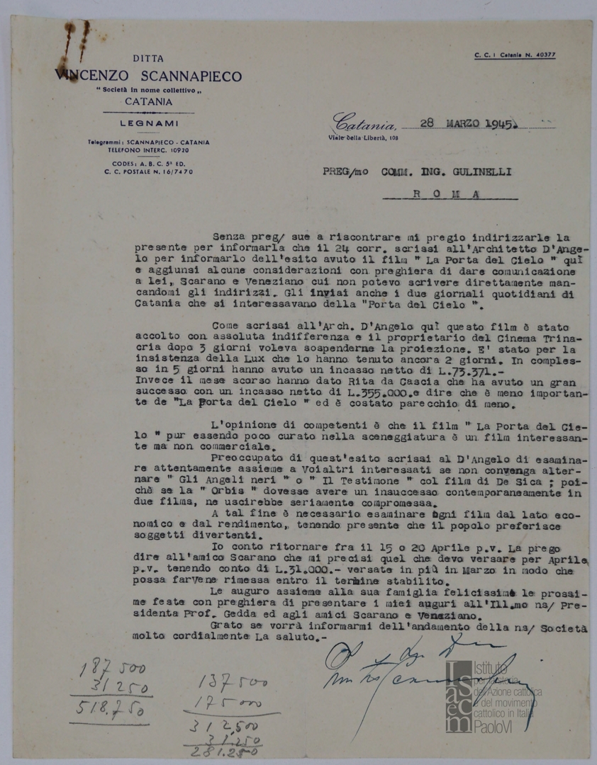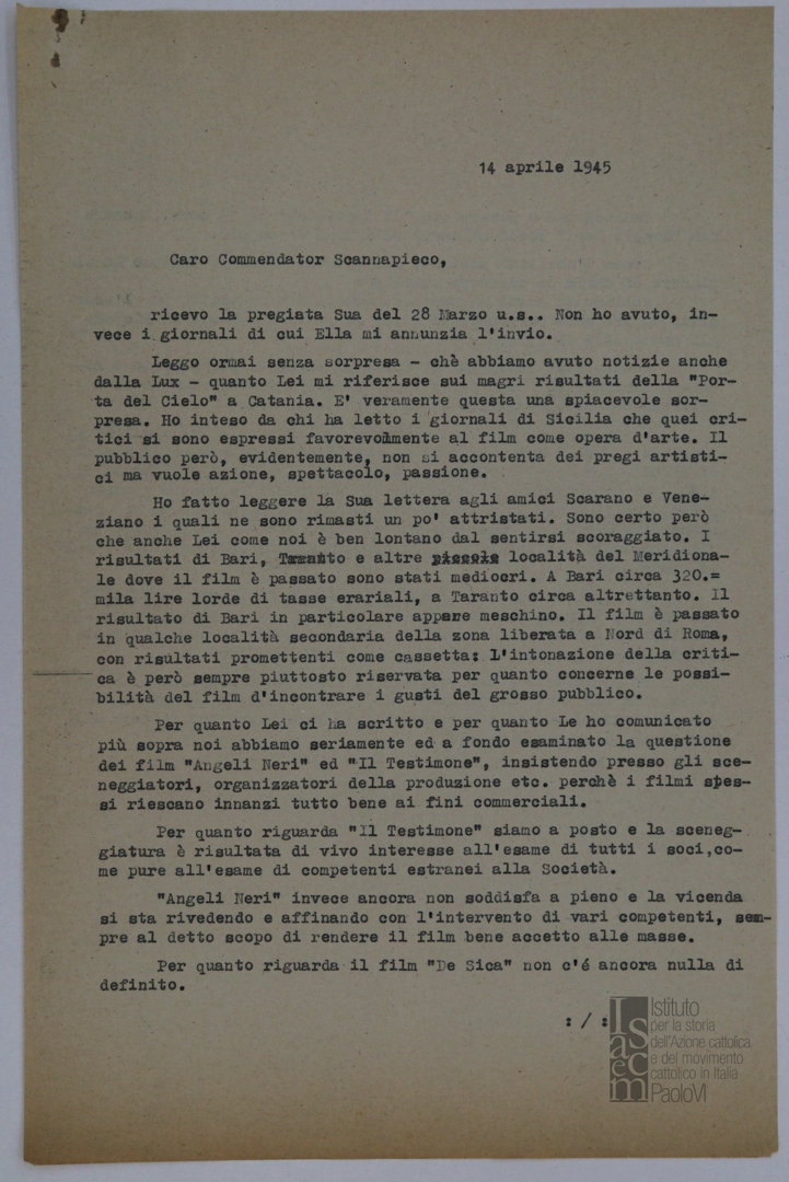 Stralcio di lettera di Antonio Baroni, consulente amministrativo del Centro cattolico cinematografico - CCC, a Luigi Gedda, presidente del Centro