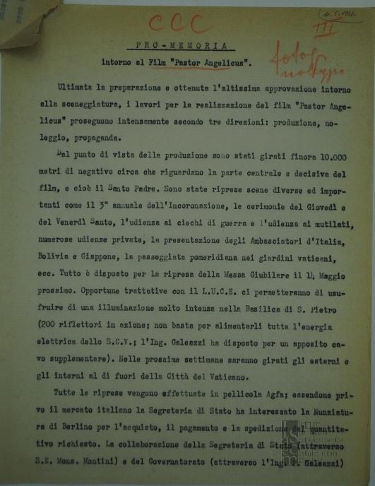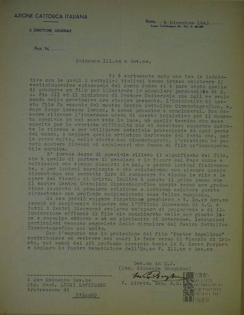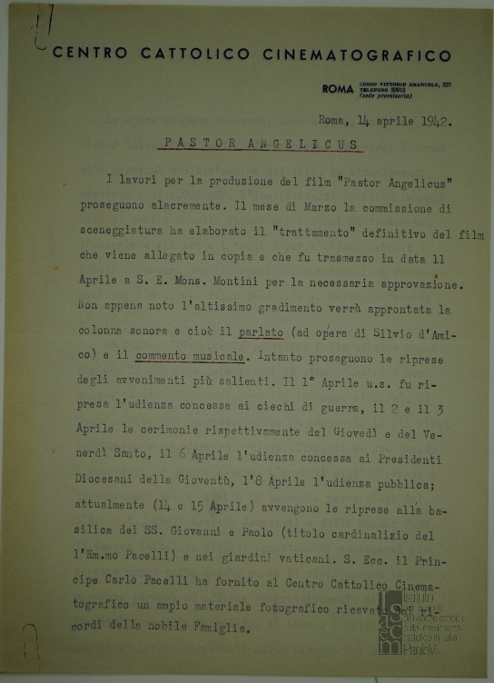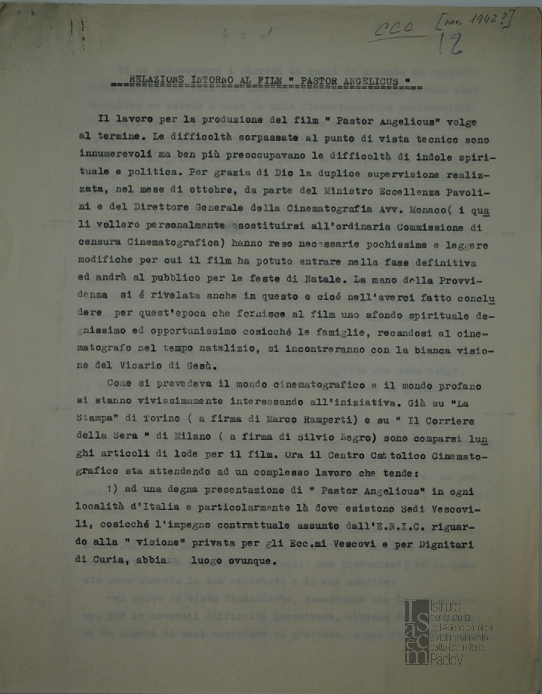 "Relazione intorno al film 'Pastor Angelicus'", a cura di Luigi Gedda, presidente del Centro cattolico cinematografico - CCC