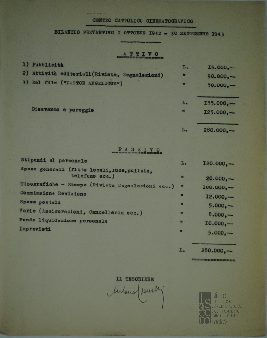 "Centro Cattolico Cinematografico. Bilancio preventivo 1° ottobre 1942 - 30 settembre 1943"