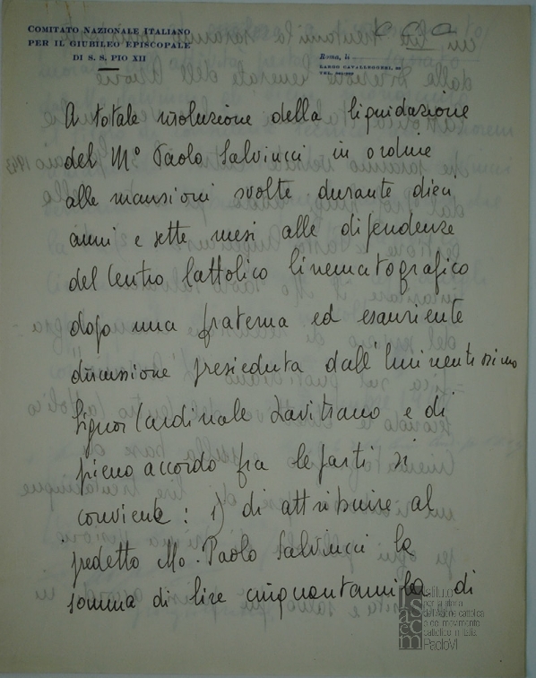 Nota a firma di Luigi Lavitrano, Luigi Gedda, Giuseppe Borghino e Paolo Salviucci, su carta intestata del Comitato nazionale italiano per il giubileo episcopale di S. S. Pio XII
