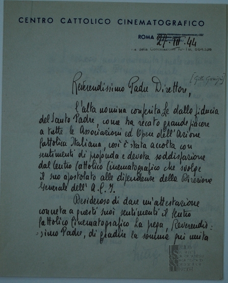 Lettera di Luigi Gedda, presidente del Centro cattolico cinematografico - CCC, a mons. Gilla Vincenzo Gremigni, direttore generale dell'ACI