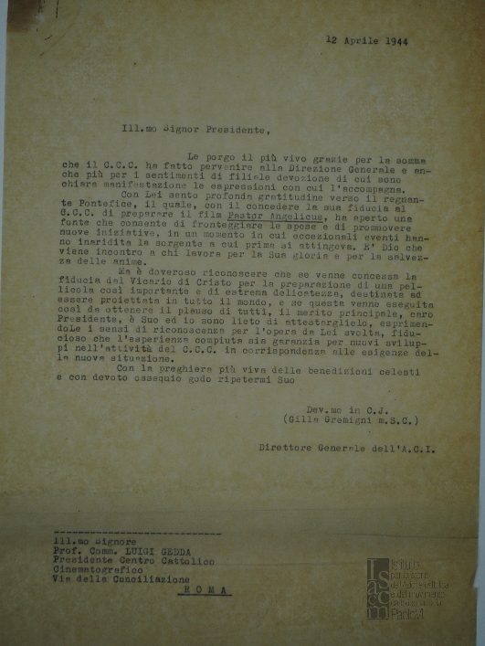 Lettera di mons. Gilla Vincenzo Gremigni, direttore generale dell'ACI, a Luigi Gedda, presidente del Centro cattolico cinematografico - CCC