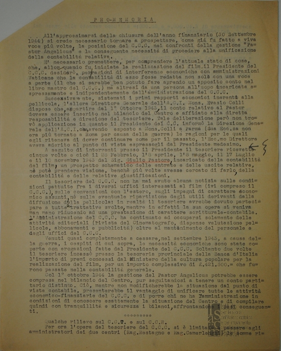 Promemoria di Urbano Cioccetti, tesoriere del Centro cattolico cinematografico - CCC