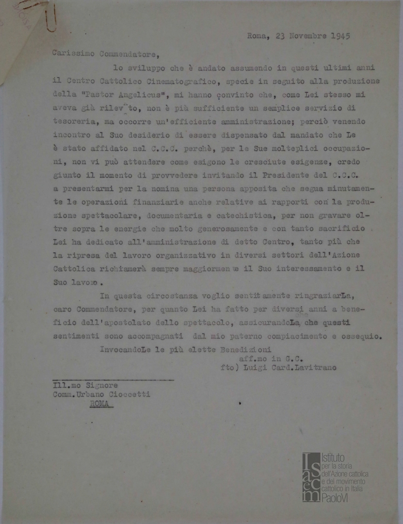 Lettera del cardinale Luigi Lavitrano, arcivescovo di Palermo e presidente della Commissione cardinalizia dell'ACI, a Urbano Cioccetti, tesoriere del Centro cattolico cinematografico - CCC