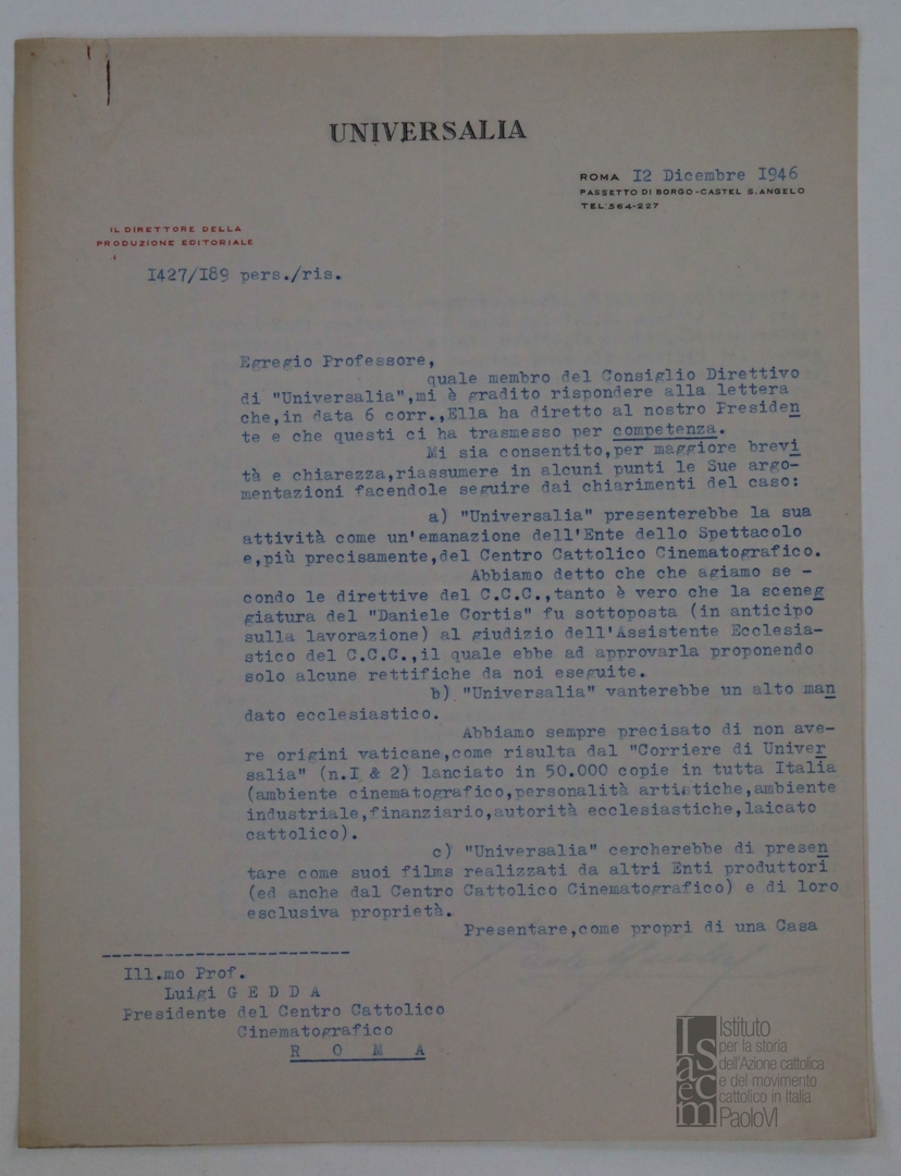 Lettera di Paolo Nicolaj, direttore della produzione editoriale di Universalia, a Luigi Gedda, presidente del Centro cattolico cinematografico - CCC
