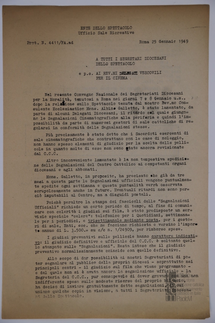 Lettera a firma di Ildo Avetta, segretario del Centro cattolico cinematografico - CCC, e di Ugo Sciascia, segretario generale dell'Ente dello spettacolo, ai segretari diocesani dello spettacolo e ai delegati vescovili per il cinema