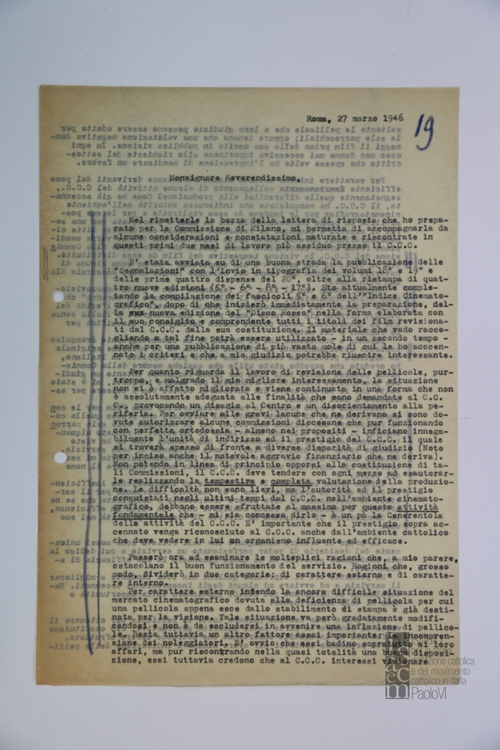 Lettera di mons. Ferdinando Prosperini, consulente ecclesiastico dell'Ente dello spettacolo, a mons. Giovanni Battista Montini, sostituto alla segreteria di Stato di Sua SantitÃ