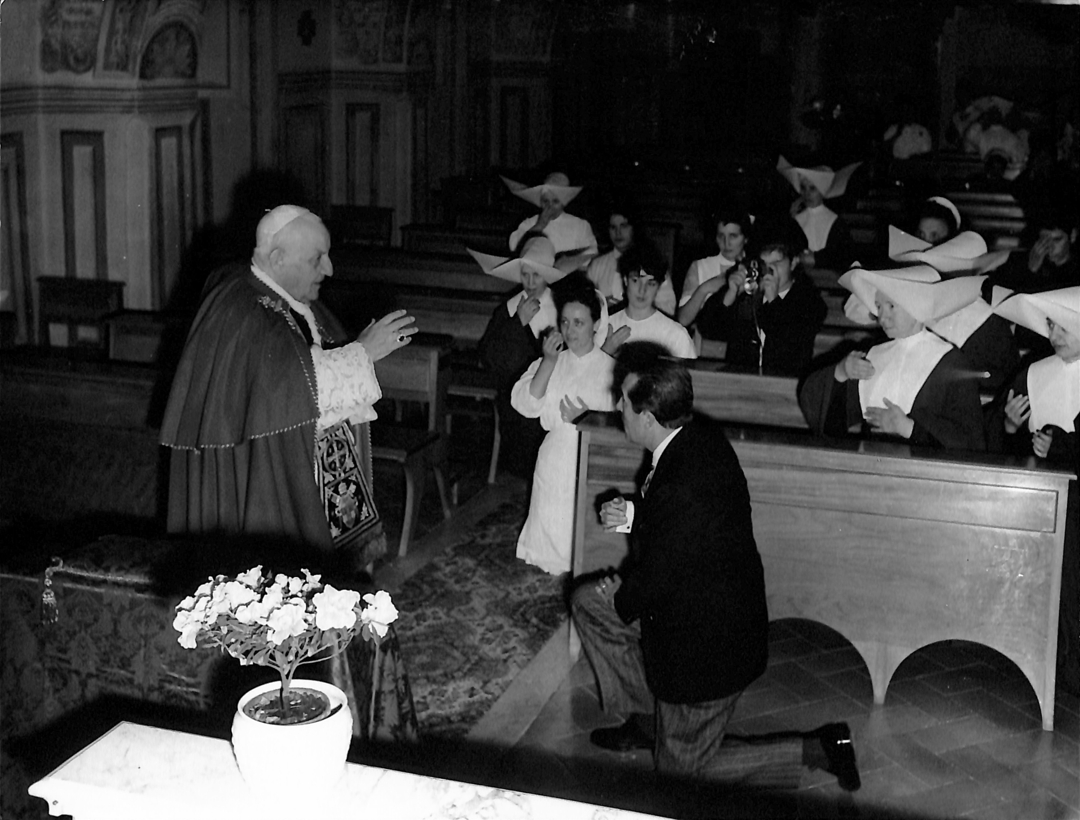Il Papa Giovanni XXIII benedice i presenti nella Cappella dell'Ospedale