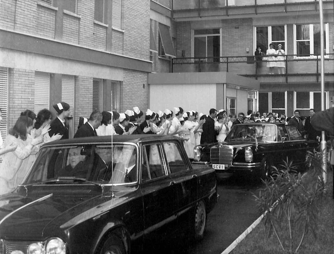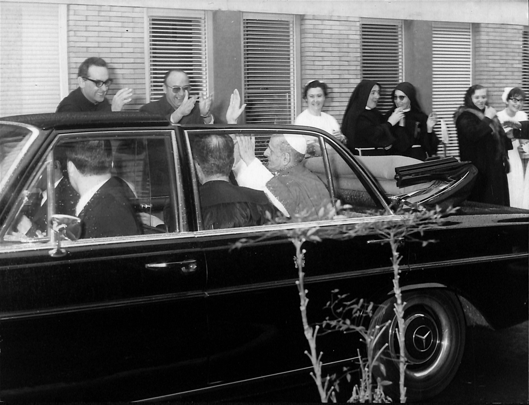 Il Papa Paolo VI, in primo piano, saluta dalla Mercedes scoperta SCV 1 le persone che lo aspettano lungo il viale centrale dell'Ospedale
