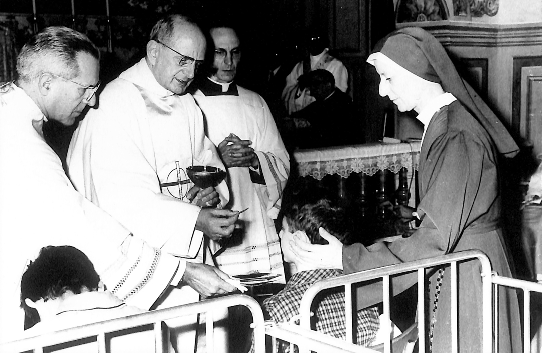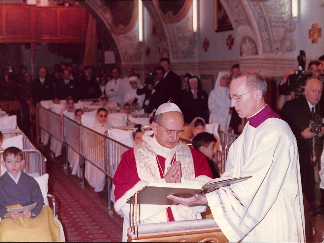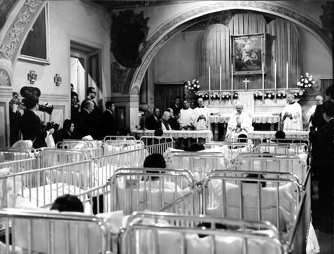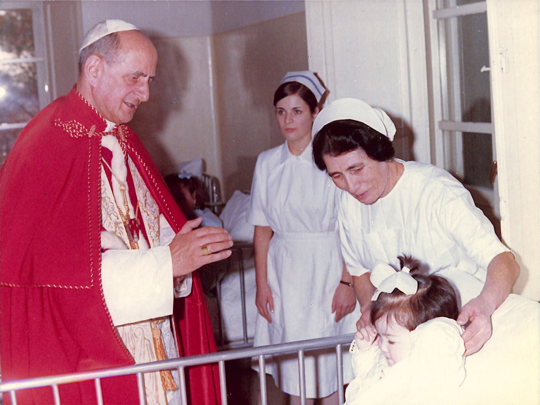 Il Papa Paolo VI si avvicina al lettino di una bimba che appare contrariata, mentre una infermiera cerca di calmarla