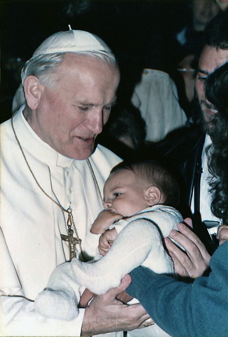 Giovanni Paolo II sorridente prende in braccio un piccolo paziente