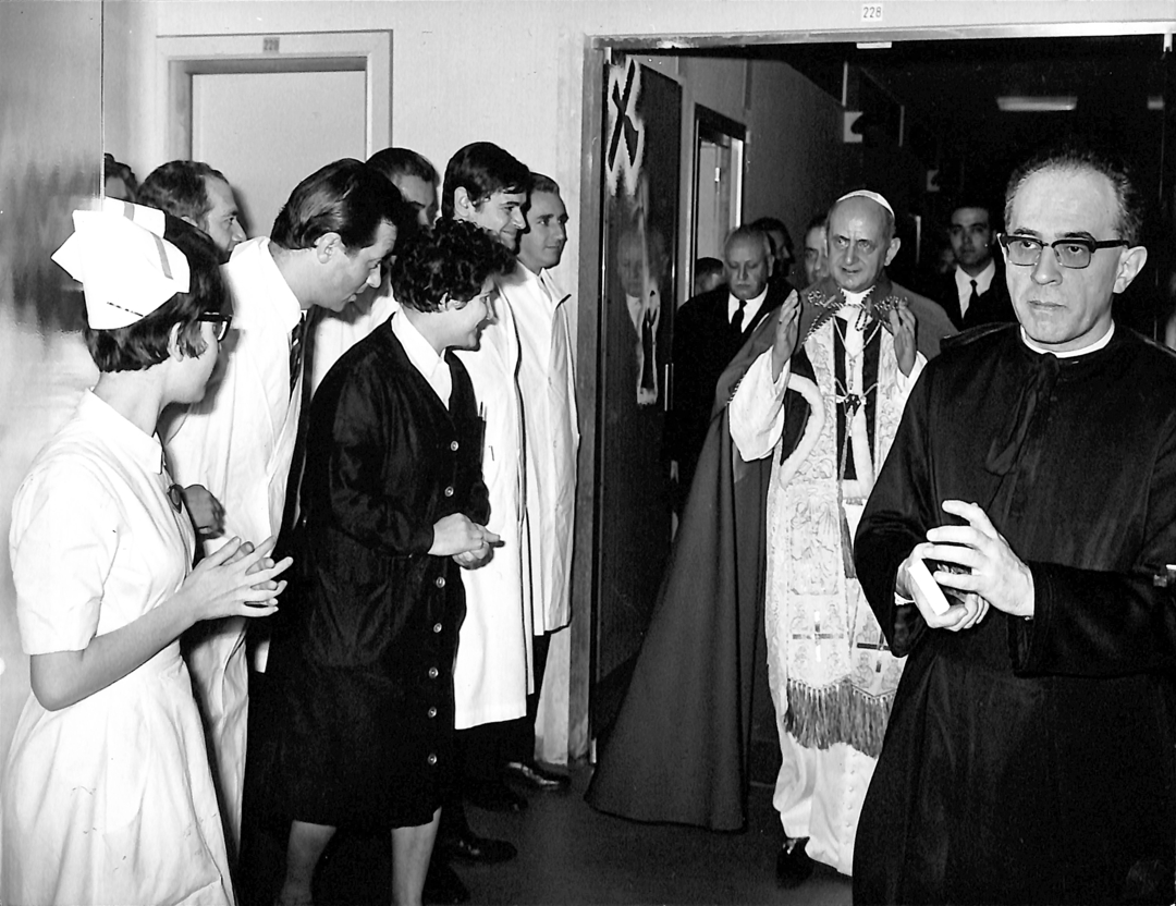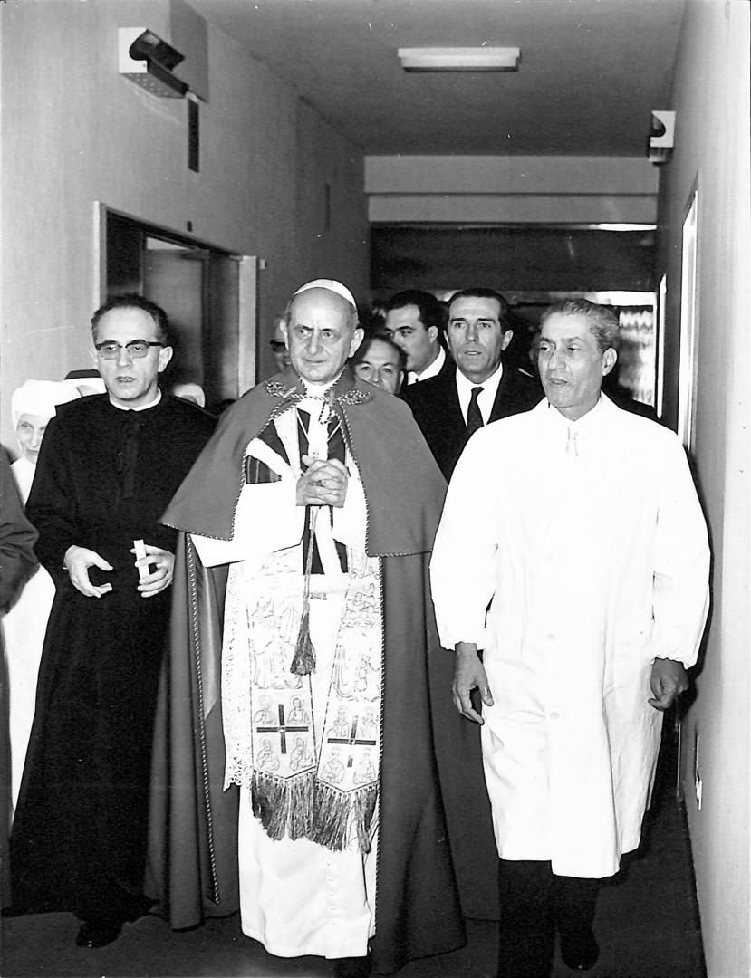 Il Papa Paolo VI accompagnato dal personale dell'ospedale