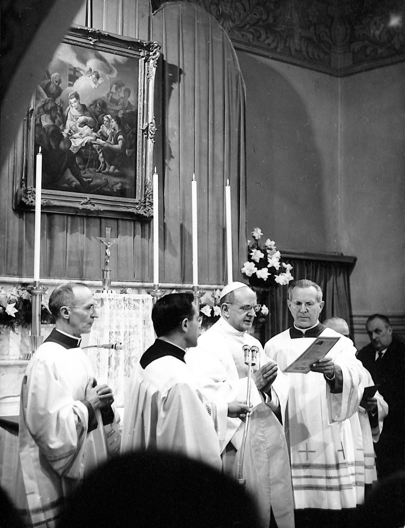 Il Papa Paolo VI, durante la celebrazione della Messa rivolto verso l'altare