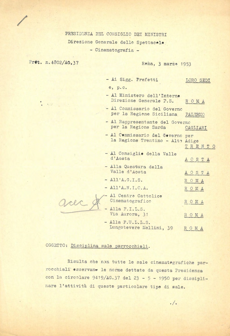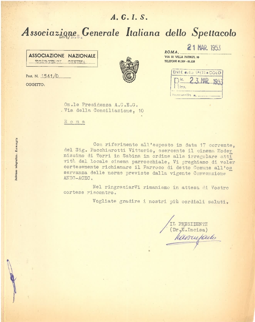 Lettera del delegato regionale ACEC del Piemonte don Angelo Salassa all'Associazione generale italiana dello spettacolo - AGIS