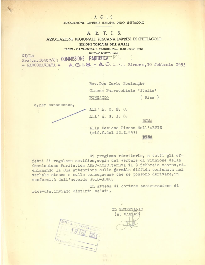 Lettera di Italo Gemini, presidente dell'Associazione generale italiana dello spettacolo - AGIS, alla presidenza dell'ACEC