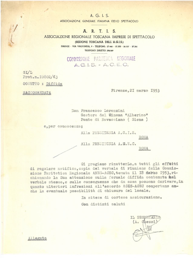 Lettera della direzione del cinema Cavour di Firenze, a firma di Pietro Pelosi, alla Direzione generale dello spettacolo