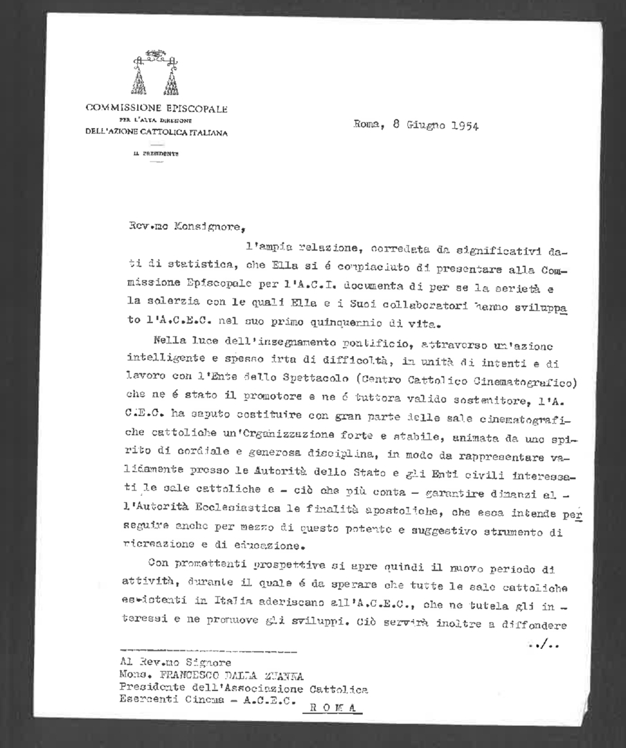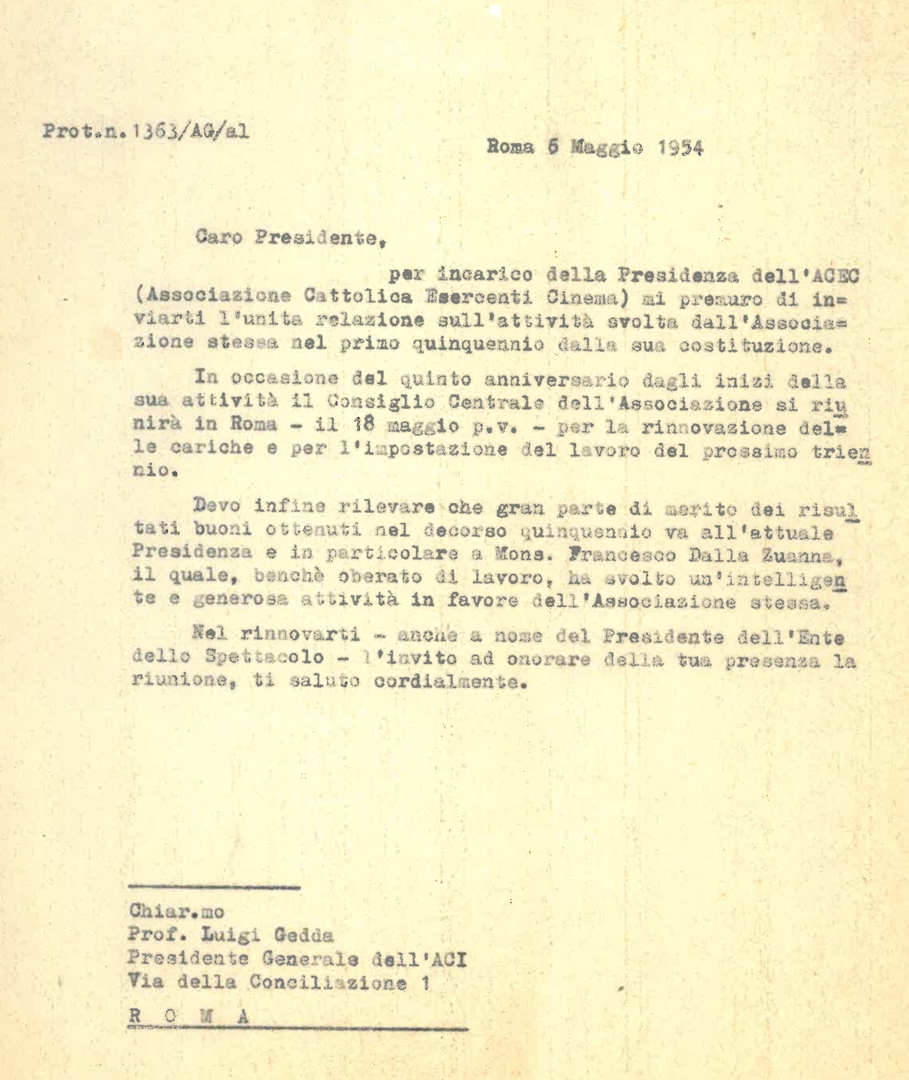 Lettera a firma di mons. Francesco Dalla Zuanna, presidente dell'ACEC e di mons. Albino Galletto, consulente ecclesiastico dell'Ente dello spettacolo, al prof. Luigi Gedda, presidente generale dell'Azione cattolica italiana - ACI