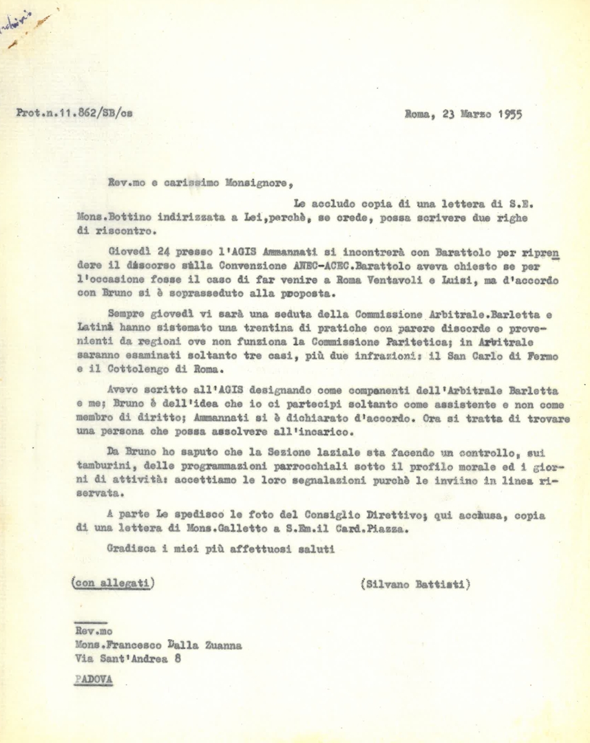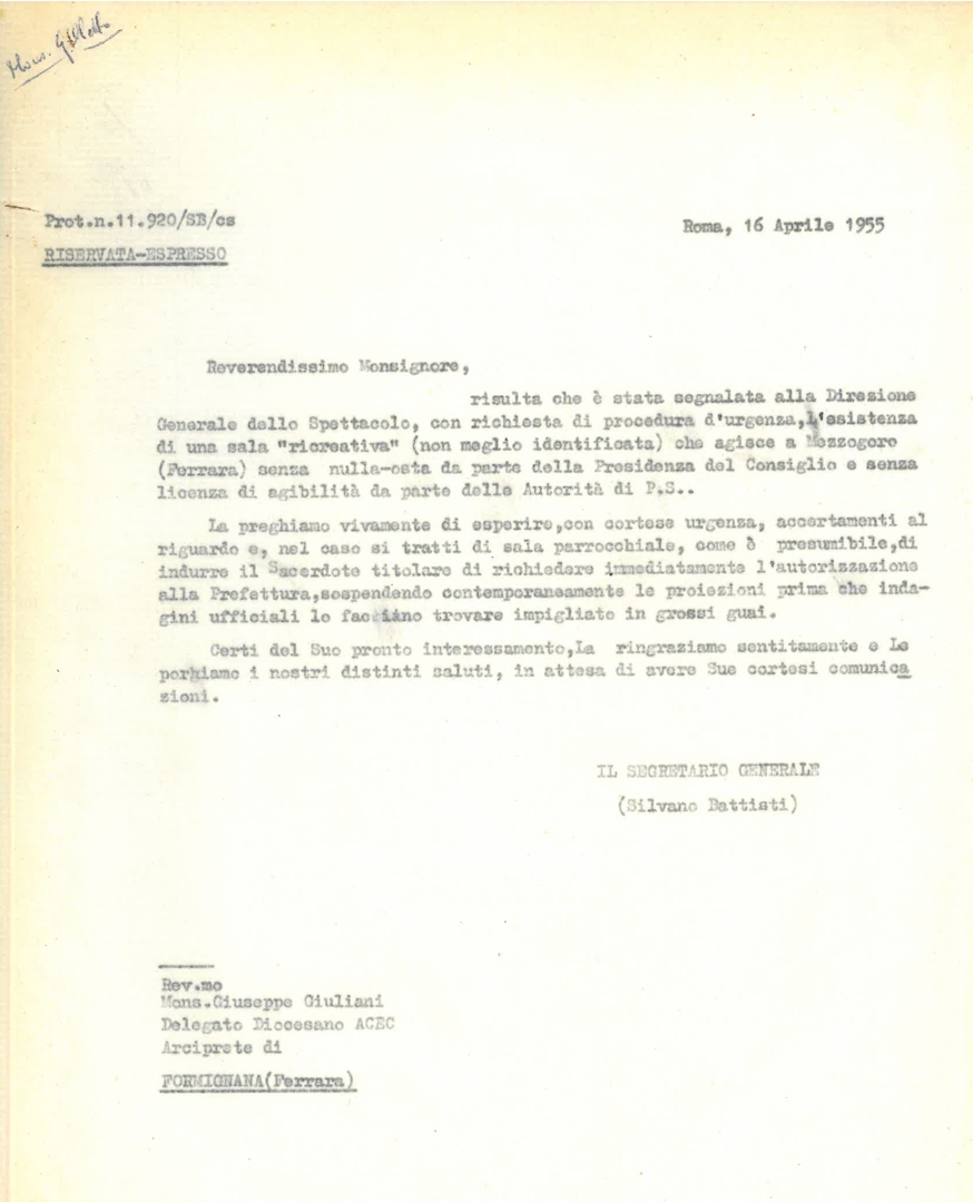 Lettera di Silvano Battisti, segretario generale dell'ACEC, a mons. Giuseppe Giuliani, delegato diocesano dell'ACEC e arciprete di Formignana in provincia di Ferrara