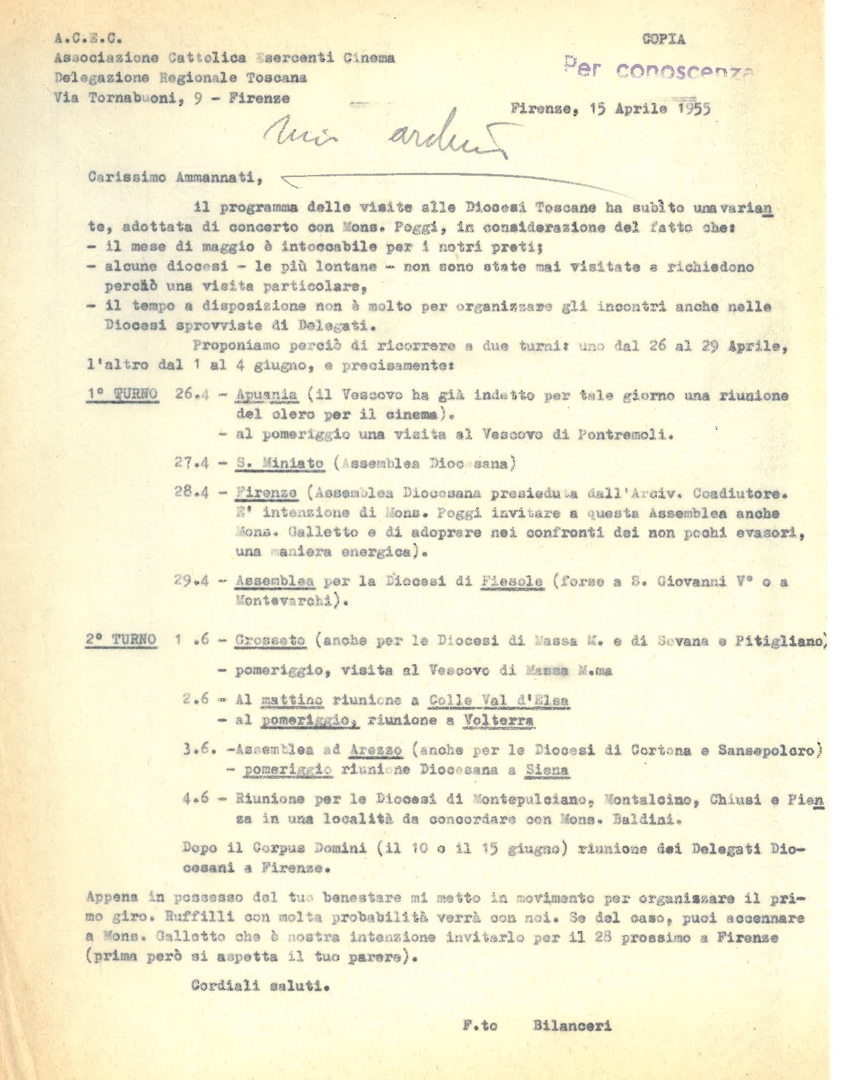 Lettera di mons. Pio C. Poggi, delegato regionale del'ACEC per la Toscana, a mons. Albino Galletto, consulente ecclesiastico dell'Ente dello spettacolo