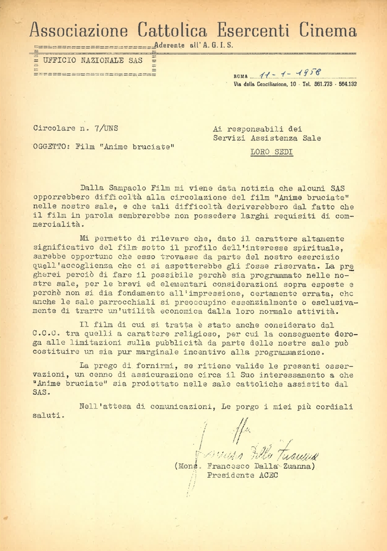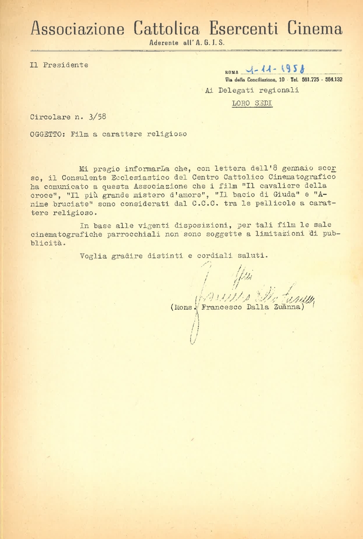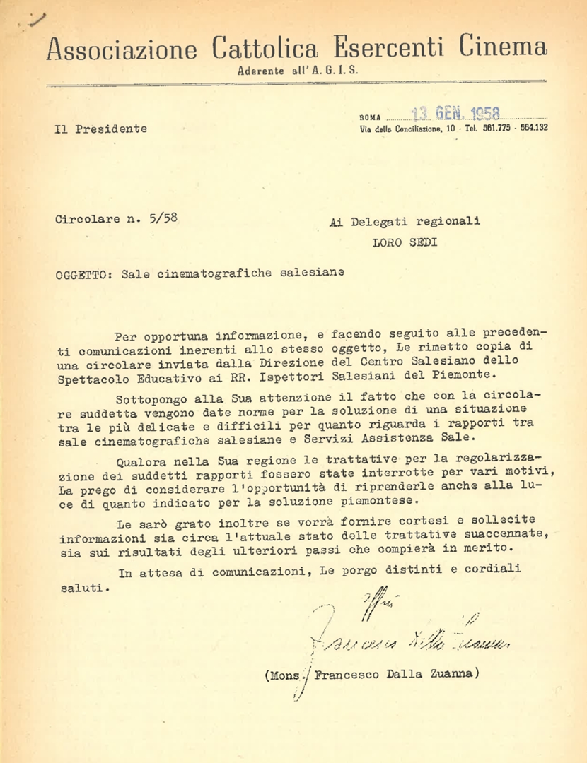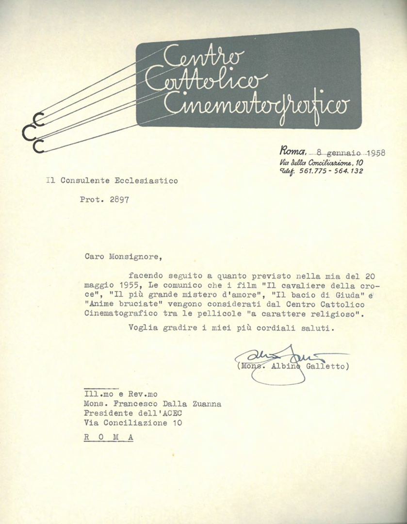 Lettera di mons. Albino Galletto, consulente ecclesiastico dell'Ente dello spettacolo, a mons. Francesco Dalla Zuanna, presidente dell'ACEC