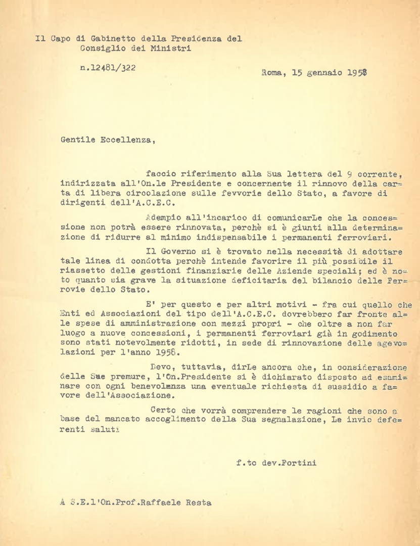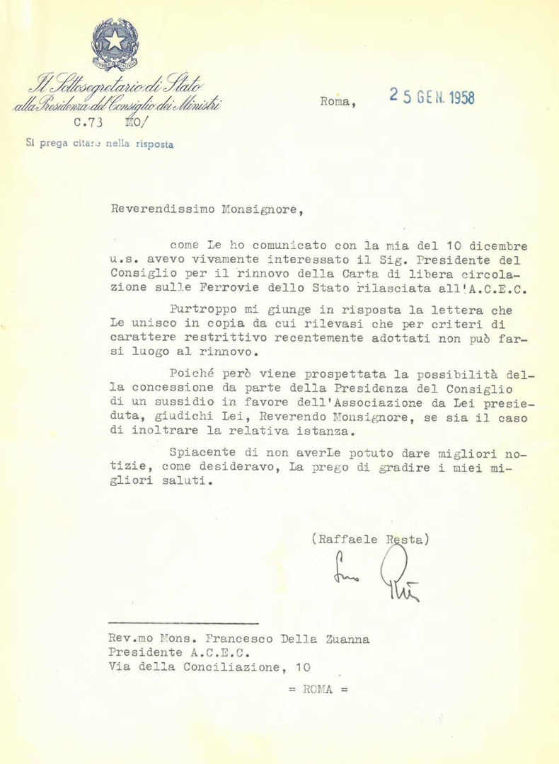 Lettera dell'on. Raffele Resta a mons. Francesco Dalla Zuanna, presidente dell'ACEC