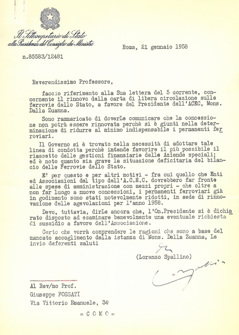 Lettera di Silvano Battisti, segretario generale dell'ACEC, a don Giuseppe Fossati