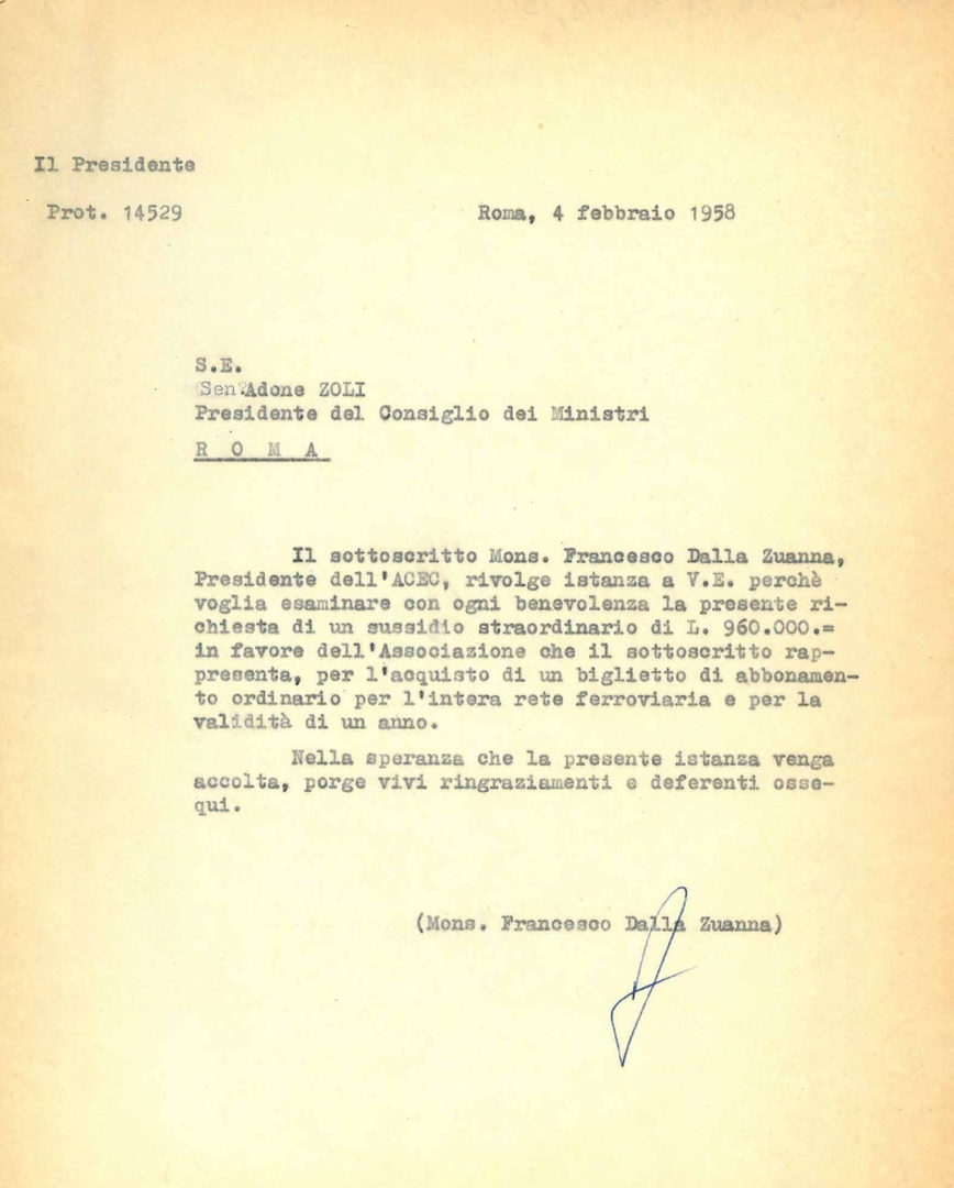 Lettera di mons. Francesco Dalla Zuanna, presidente dell'ACEC, all'on. Adone Zoli