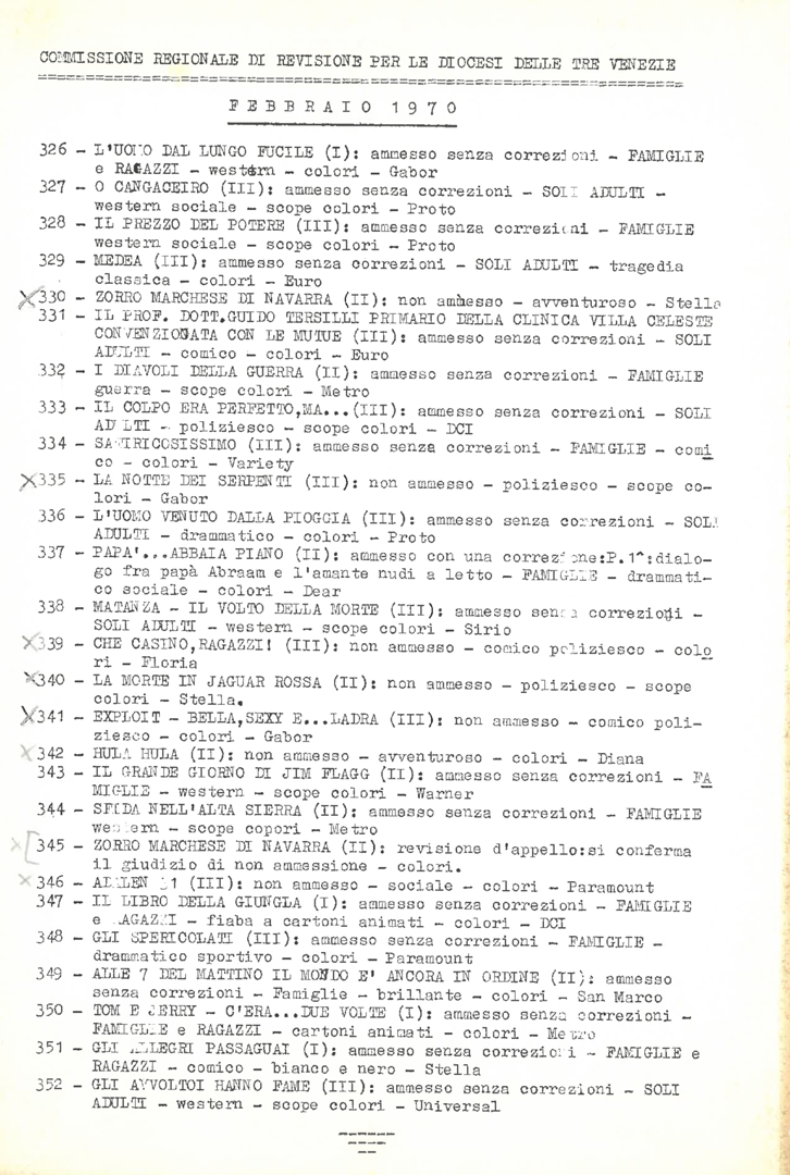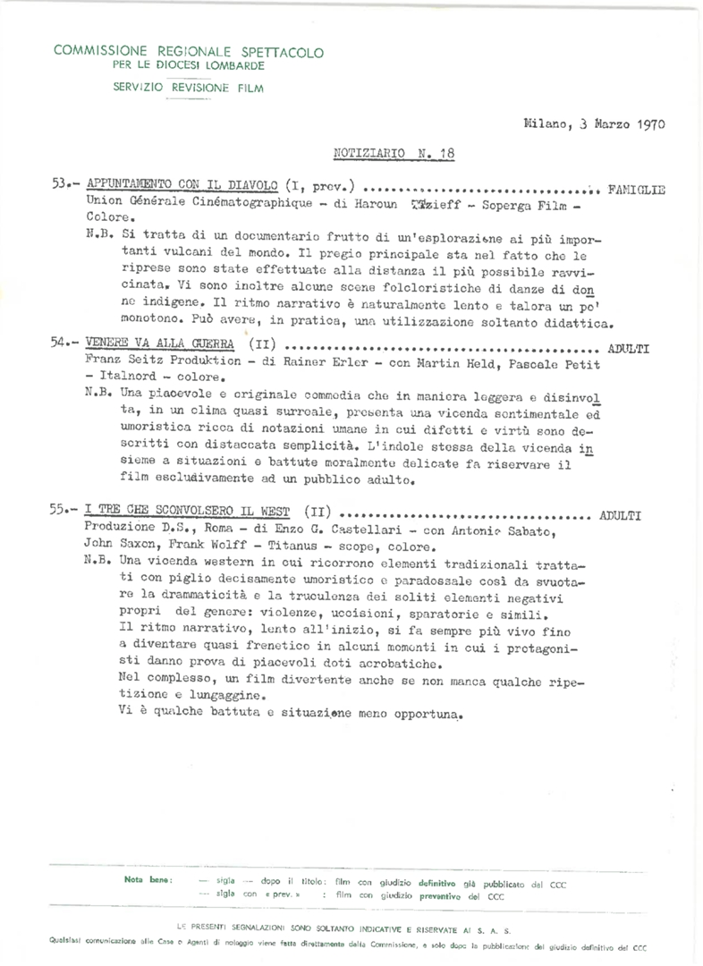 Classificazione di film, a cura della Commissione regionale di revisione per le diocesi delle Tre Venezie
