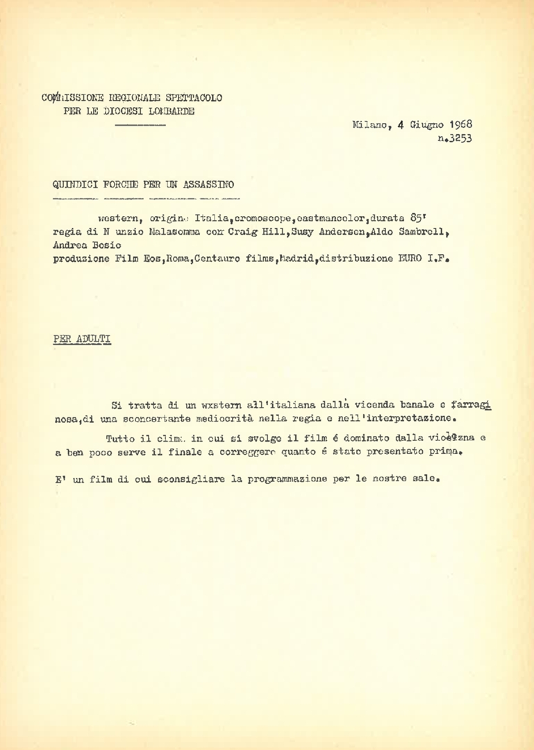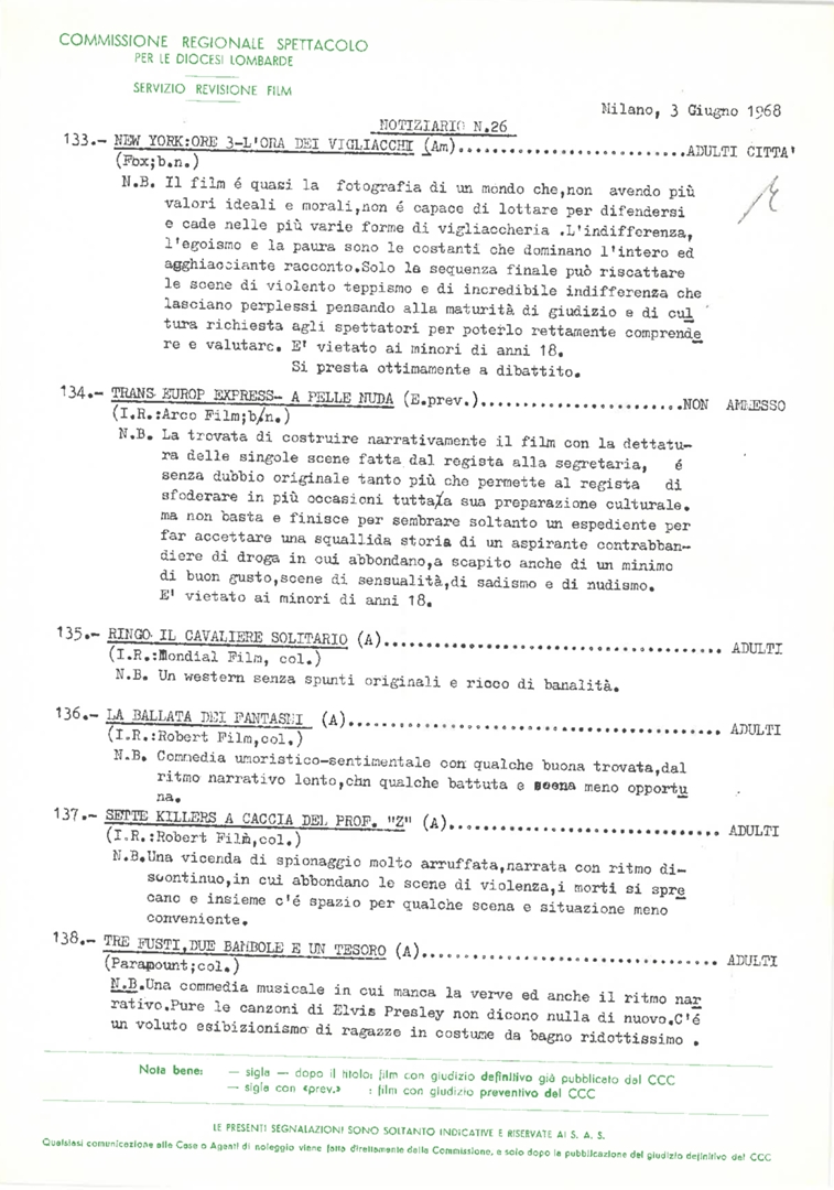 "Osservazioni circa la proposta di nuovi criteri per la classificazione dei film e circa le note esplicative", a cura della commissione diocesana per lo spettacolo di Firenze