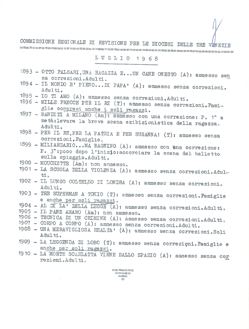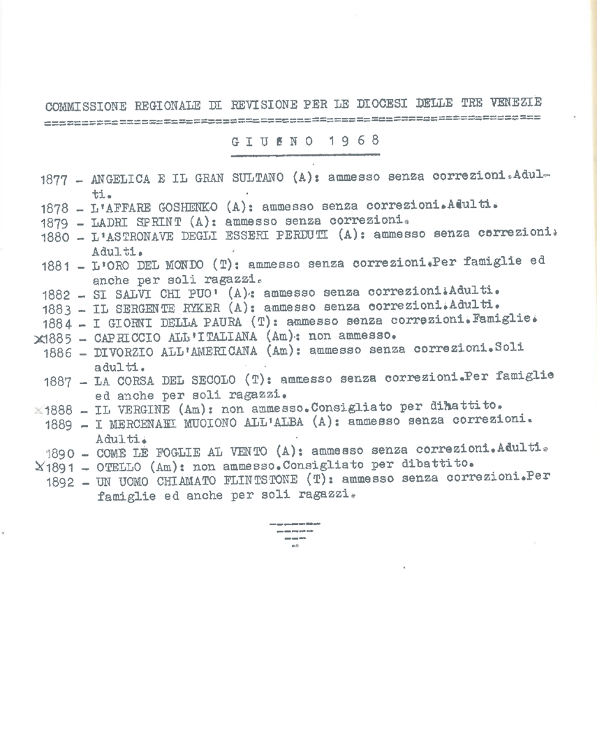 Classificazione di film, a cura della Commissione regionale di revisione per le diocesi delle Tre Venezie