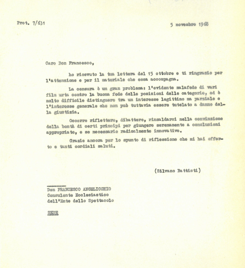 Lettera di Silvano Battisti, segretario generale dell'ACEC, a don Francesco Angelicchio, consulente ecclesiastico dell'Ente per lo spettacolo, sul tema della censura cinematografica