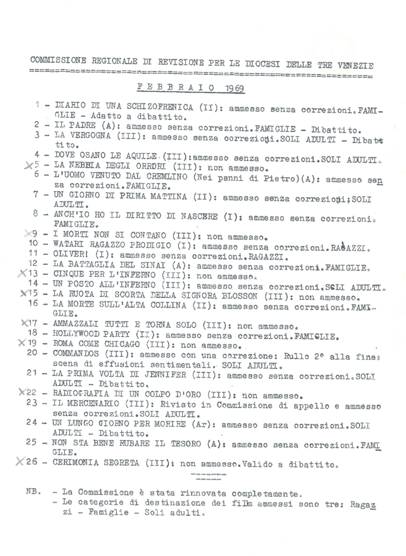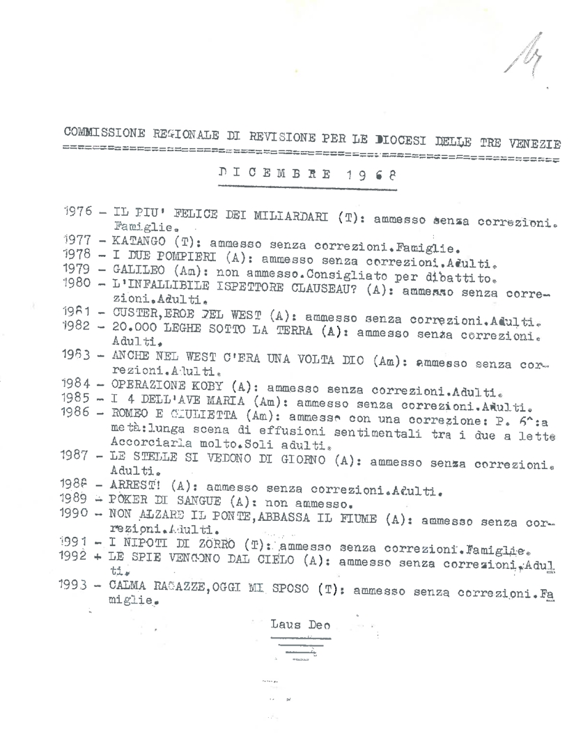 Classificazione di film, a cura della Commissione regionale di revisione per le diocesi delle Tre Venezie