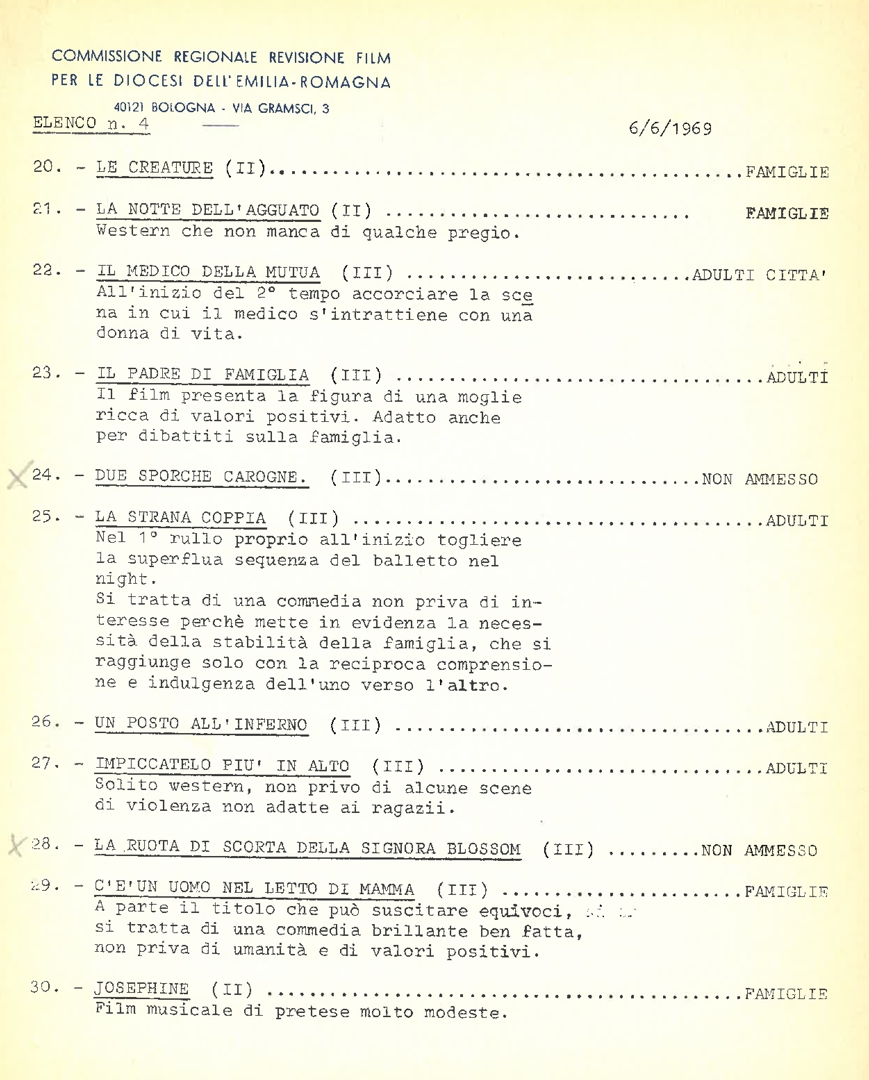 Classificazione di film, a cura della Commissione regionale di revisione film per le diocesi dell'Emilia-Romagna