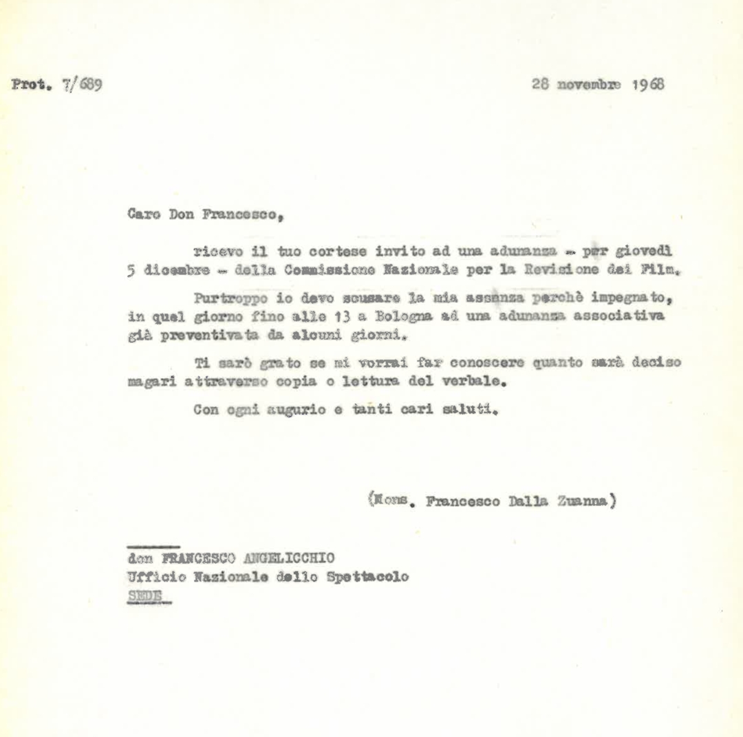 Lettera di mons. Francesco Dalla Zuanna, presidente dell'ACEC, a Sandro Zambetti, presidente della Federazione Italiana Cineforum - FIC